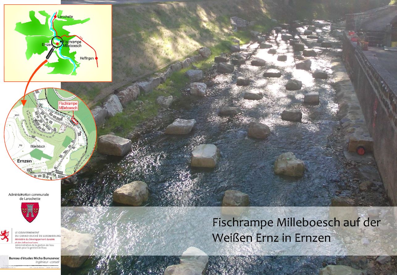 Construction d'une passe à poissons sur le barrage de la l'Ernz Blanche dénommé « Milleboesch » à Erzen.