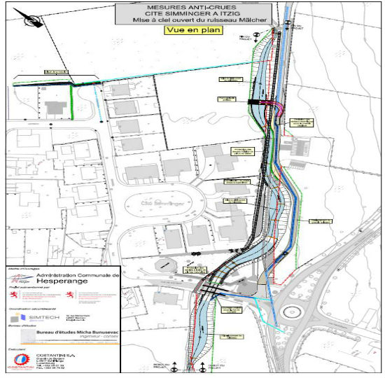 - mesure anti-crues : Mise à ciel ouvert de l’Itzigerbaach avec réalisation d’une digue en amont de la cité Simminger et élargissement du pont sous la rue de Contern.