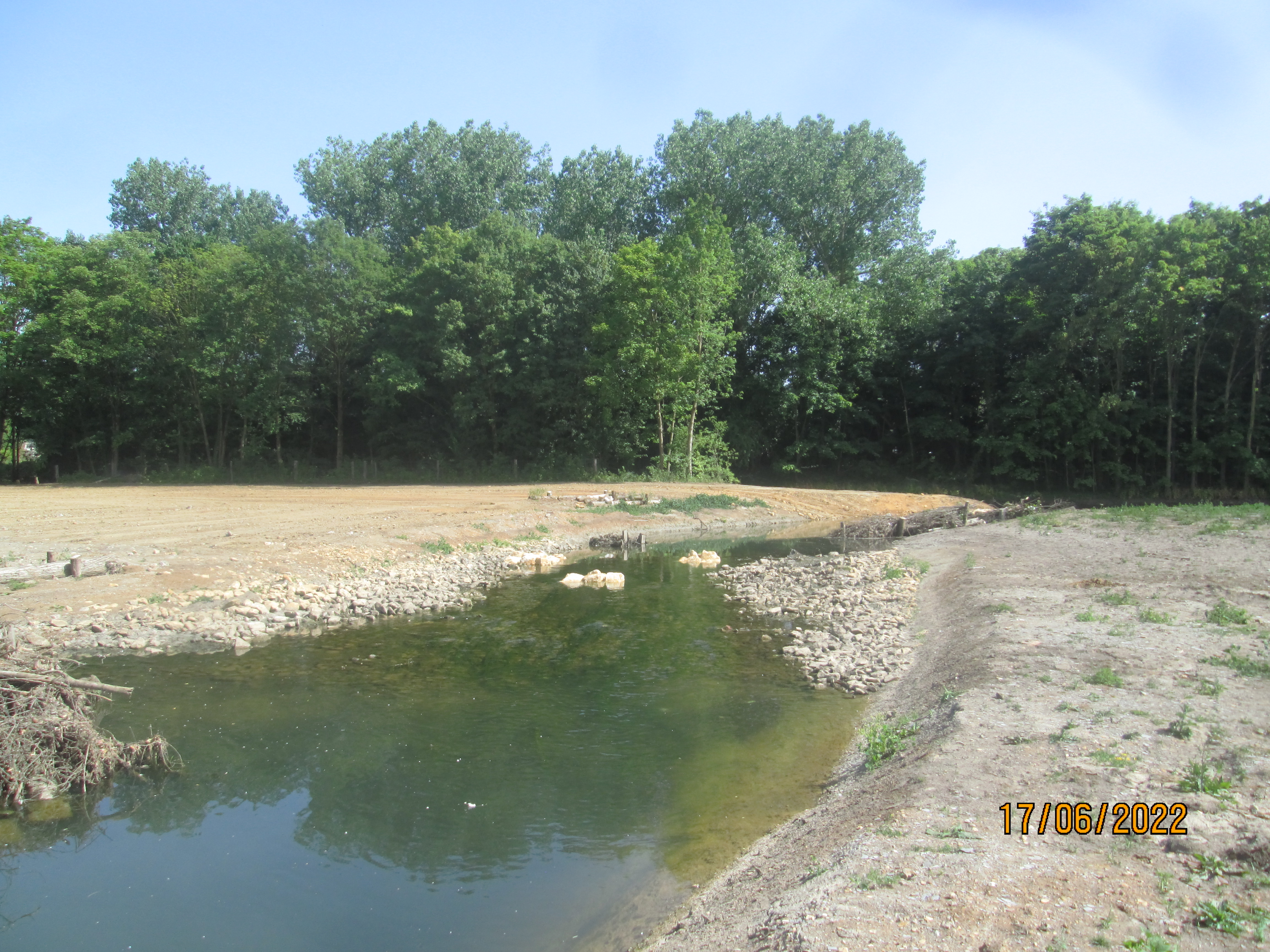 Les travaux ont débuté en décembre 2021 et se sont finalisés en juillet 2022. Le chantier a ensuite été placé en observation pendant une année dans le but de constater d’éventuels dysfonctionnements dans le cours d’eau, et afin de permettre le passage de crues hivernales sur le secteur renaturé. Après constatation d’une renaturation réussie donnant libre cours à l’évolution naturel du site, le chantier a pu être réceptionné en octobre 2023.